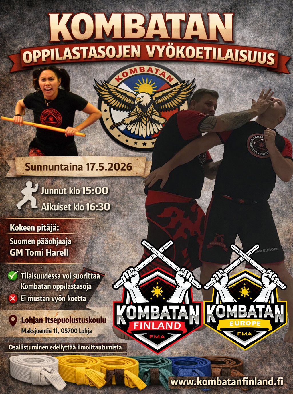 ✔ Tilaisuudessa voi suorittaa Kombatan oppilastasoja, osallistuminen edellyttää ennakkoilmoittautumista